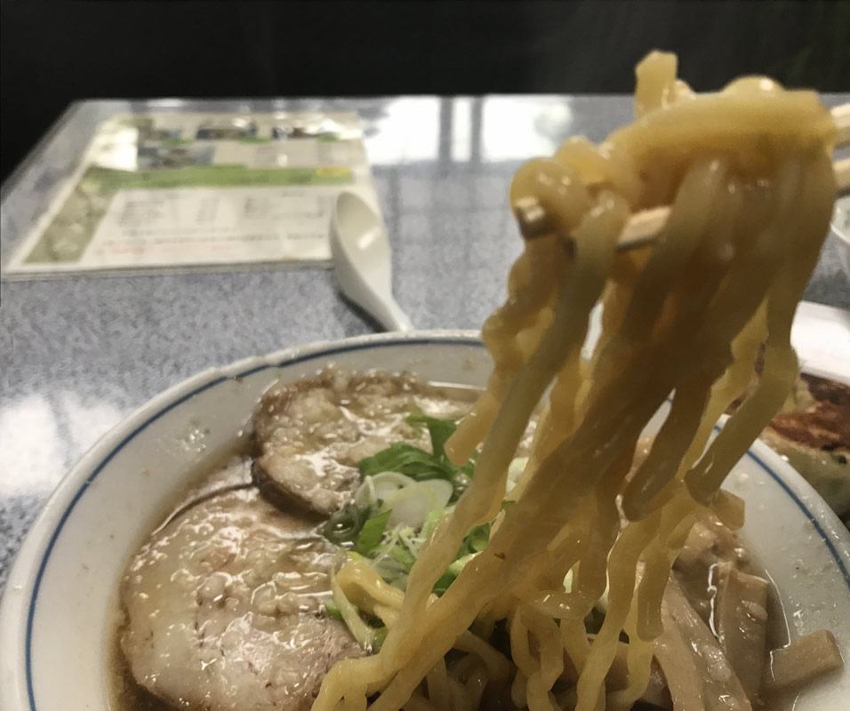 めんは縮れ太麺で、スープは魚介の醤油味になります。